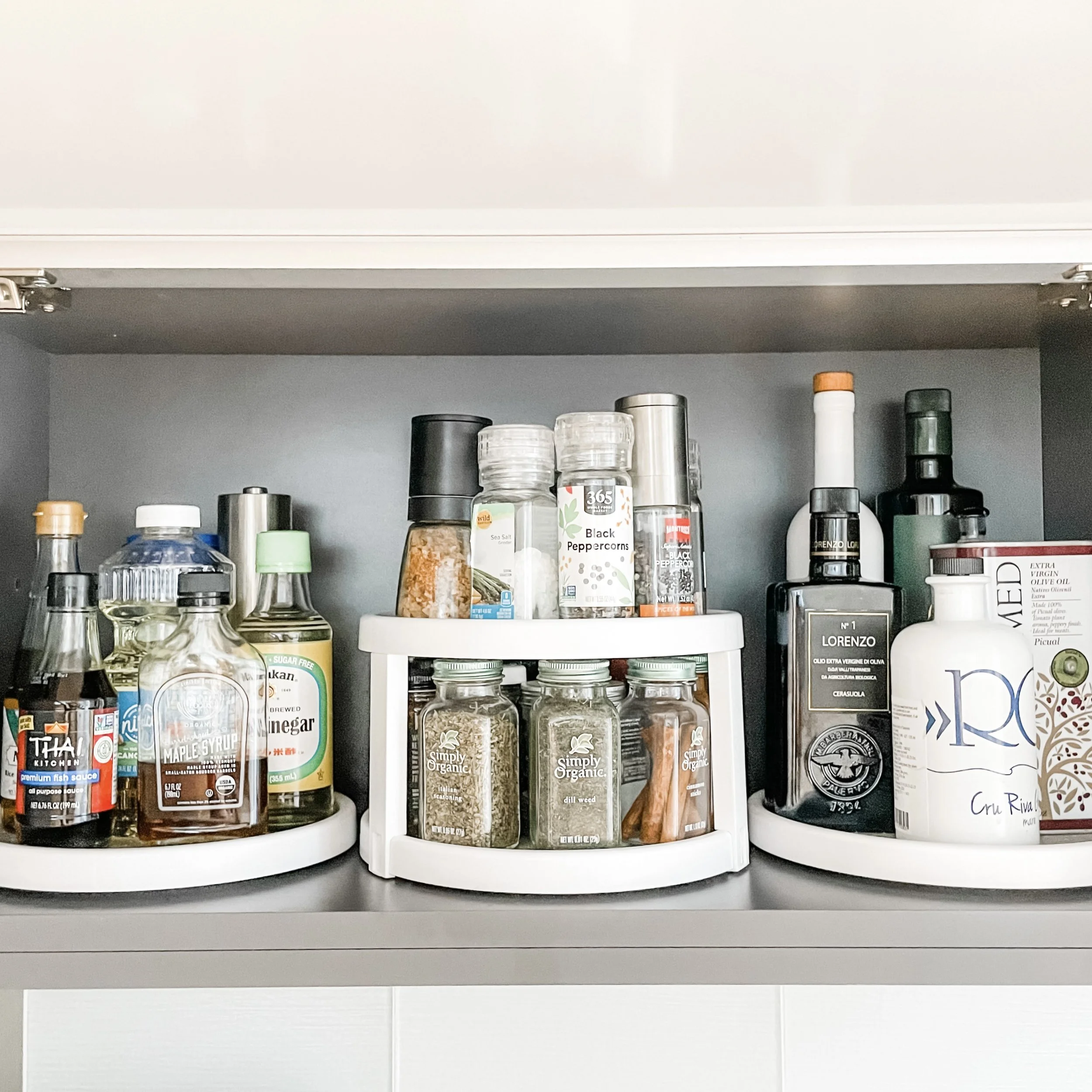 My husband and I love to cook so it’s no surprise that we have tons of spices and seasonings in our home. In order to get the most bang for our spatial buck, we utilize a 2-tier turntable to double our spice storage without taking up an entire cabinet of valuable real estate.