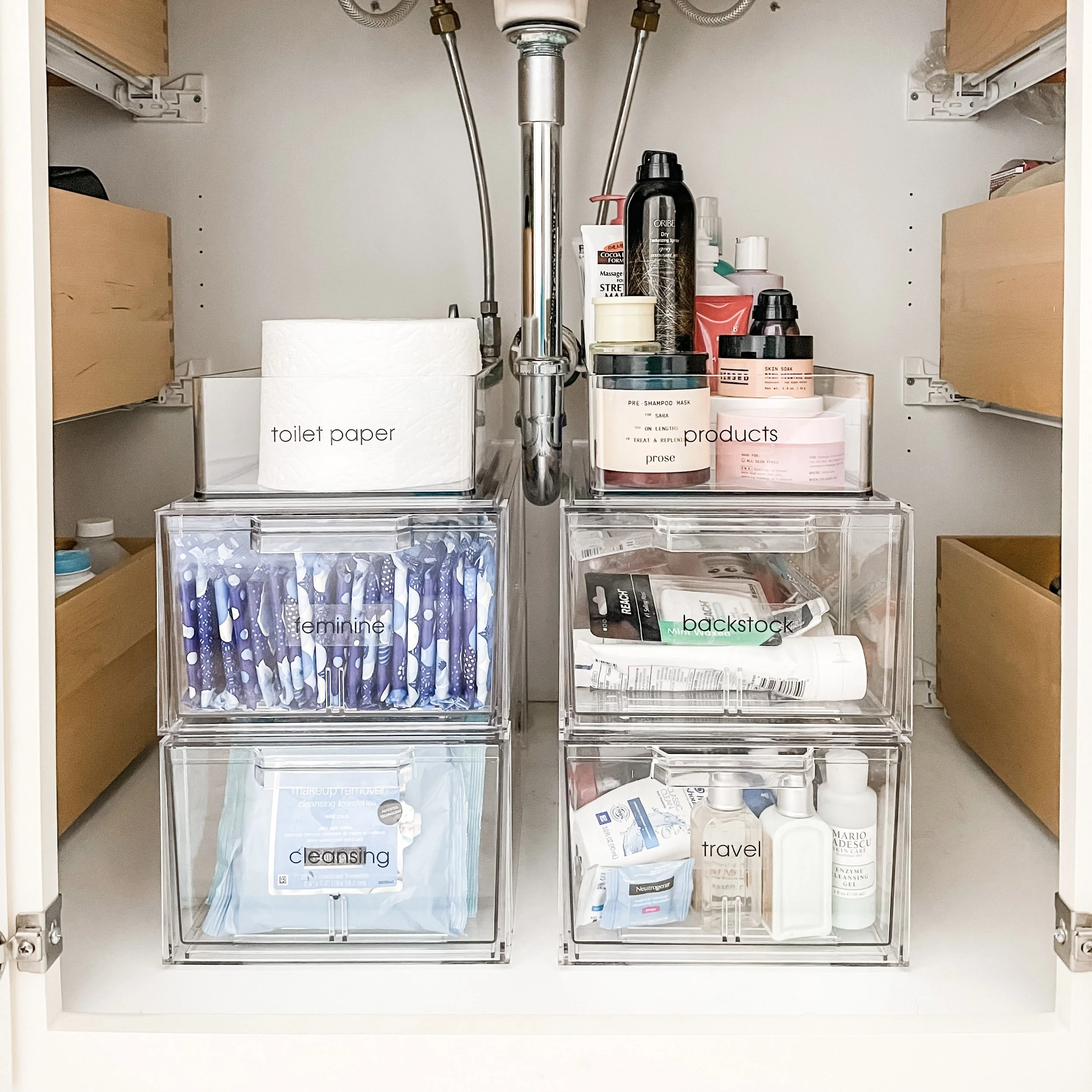Organizing under sinks can be a daunting task because the combination of pipes and a lot of vertical space can feel like you’re losing out on some serious (and valuable) storage! We recommend using a stackable drawer system so that your items remain accessible and functional while maximizing the vertical space. These are also great for under your kitchen sink or in a utility closet for miscellaneous odds and ends.
